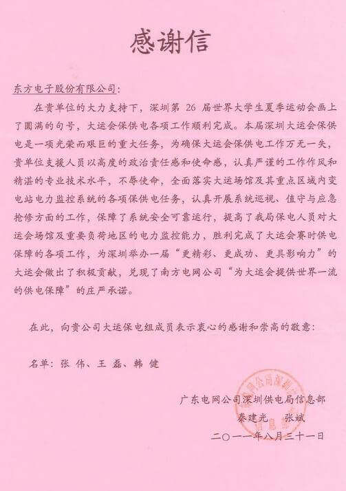8月23日,世界大学生运动会在深圳圆满落幕,成都伟科特科技有限公司作为大运会唯一保电企业见证了世界大学生体育运动的蓬勃发展。成都伟科特科技有限公司技术中心系统部与工程部坚守“忠于职守,全力以赴,誓保大运电网安全”的信念,联手实现了大运保供电期间系统零故障、零缺陷的目标。
